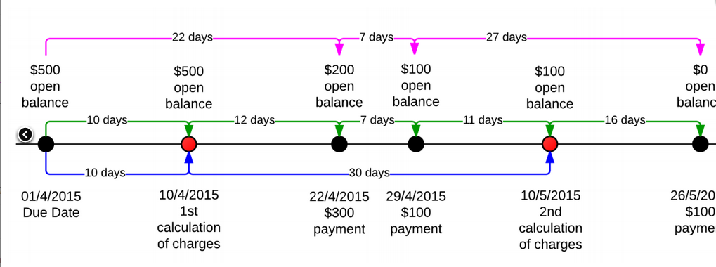 - The charges are the sum of charges applied to the $500 open balance for 22 days overdue, to the $200 open balance for 7 days overdue, and to the $100 open balance for 27 days overdue (the pink lines in the figure).
